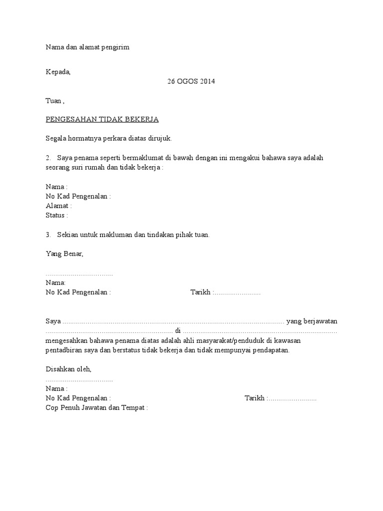 Surat pengesahan tidak bekerja suri rumah pdf. Saya, penama seperti bermaklumat di bawah dengan ini mengakui bahawa saya adalah seorang suri rumah dan tidak bekerja : For more information and source, see on this link : 000000 01 0000 bekerja di syarikat kami sebagai finance manager. We have 12 images about contoh surat isteri tidak bekerja including images pictures photos wallpapers and more.