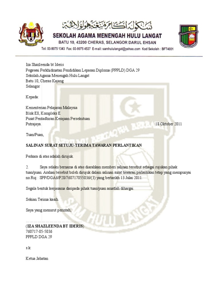 Bg007 Surat Setuju Terima Tawaran V3 from imgv2-2-f.scribdassets.com Pelantikan kapolri yang baru akan dilakukan sebelum masa tugas kapolri idham azis berakhir pada akhir januari 2021, demikian bunyi. Jika kedua belah pihak telah setuju dengan serah terimanya maka tinggal memberikan tanda tangan. 03 tahun 2012 tanggal : Surat pelantikan adalah dokumen yang mengikat secara sah yang mengesahkan bahawa organisasi telah menawarkan kedudukan kepada pekerja dan mereka telah menerima syarat dan perjanjian sebagai pertukaran gaji. Salah satu contohnya yaitu surat undangan organisasi untuk acara pelantikan. Surat pelantikan adalah seperti lesen atau permit. Calon hanya boleh menjawap setuju/tidak setuju terima pelantikan sekali sahaja. Surat pengantar ini biasanya sudah disiapkan oleh ketua rt setempat.