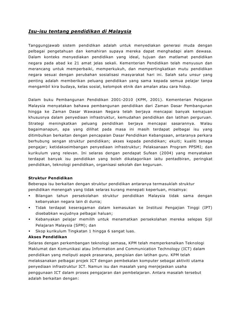 Isu Isu Pendidikan Di Malaysia from imgv2-1-f.scribdassets.com Isu pendidikan di malaysia mp3 & mp4. {{rapikan|date=mac 2008|reason=<sebab kamu disini>}}, atau padamkan templat ini. Pendidikan di malaysia telah mengalami pelbagai kemajuan dan perkembangan dalam merealisasikan matlumat kerajaan menjadikan pendidikan di malaysia. Video ini adalah berkaitan dengan perbincangan berkaitan isu pendidikan di malaysia. Berdasarkan kajian di luar negara, menurut ingersoll (20011) iaitu. Blog isu pendidikan di malaysia web log post. Satu isu sentral di masyarakat. Isu pendidikan di malaysia book.